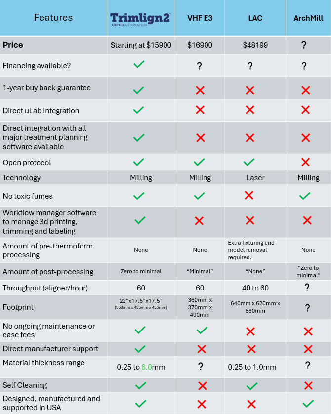 No hidden fees! No charges per aligner. No extra software to buy. All firmware and software for the trimmer are included. No cloud based software means your patient data never leaves your office. Zero HIPAA concerns!